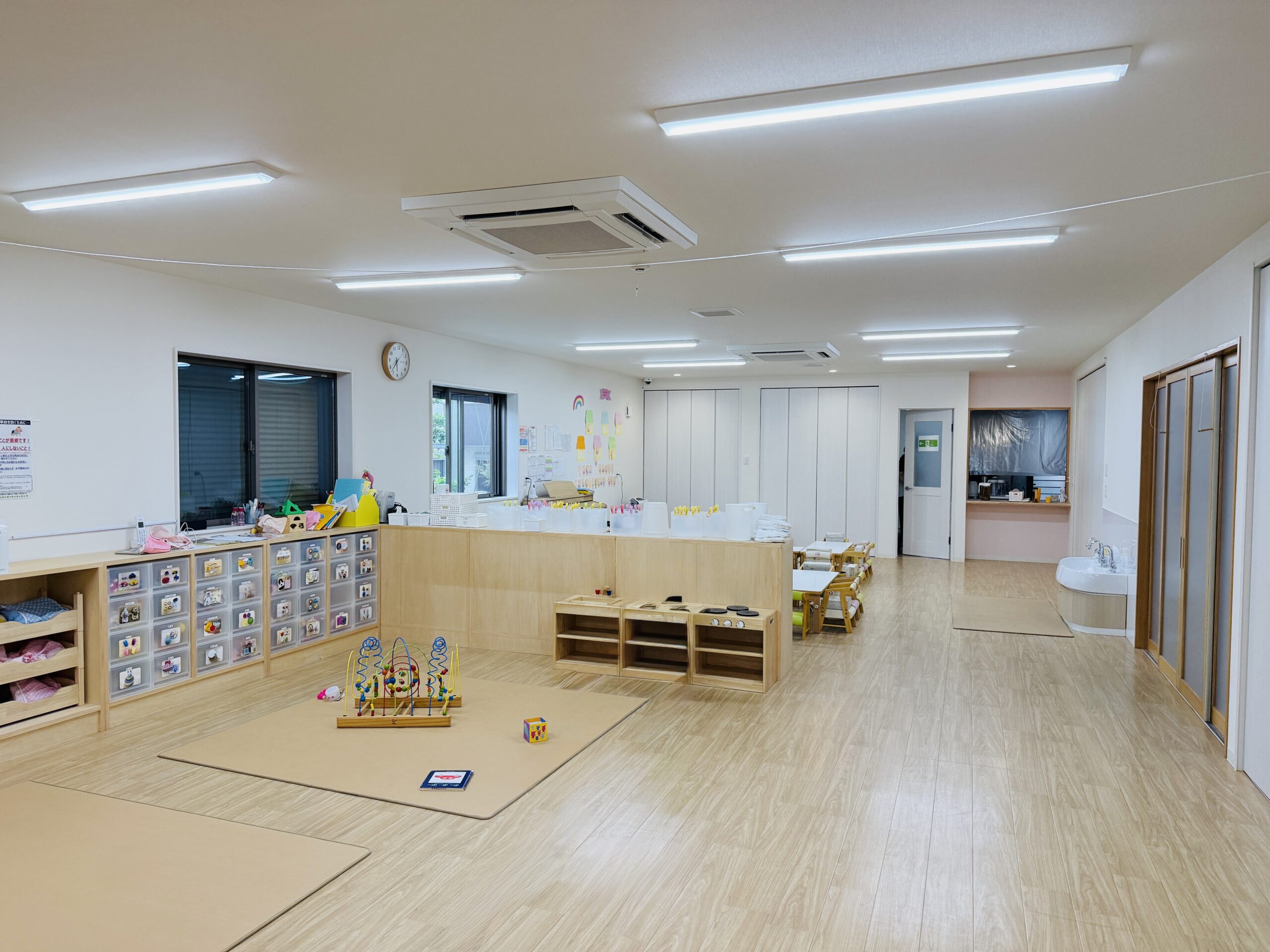 2016年4月に開園した小規模保育園。保育室の外にはウッドデッキのテラスを設置し、ひなたぼっこしながらプレイジムや絵の具遊びを楽しみます。また、お隣に併設のにじの木保育園園庭で毎日泥んこ遊びやボール遊び、暑い夏には水遊びを存分に楽しみます。